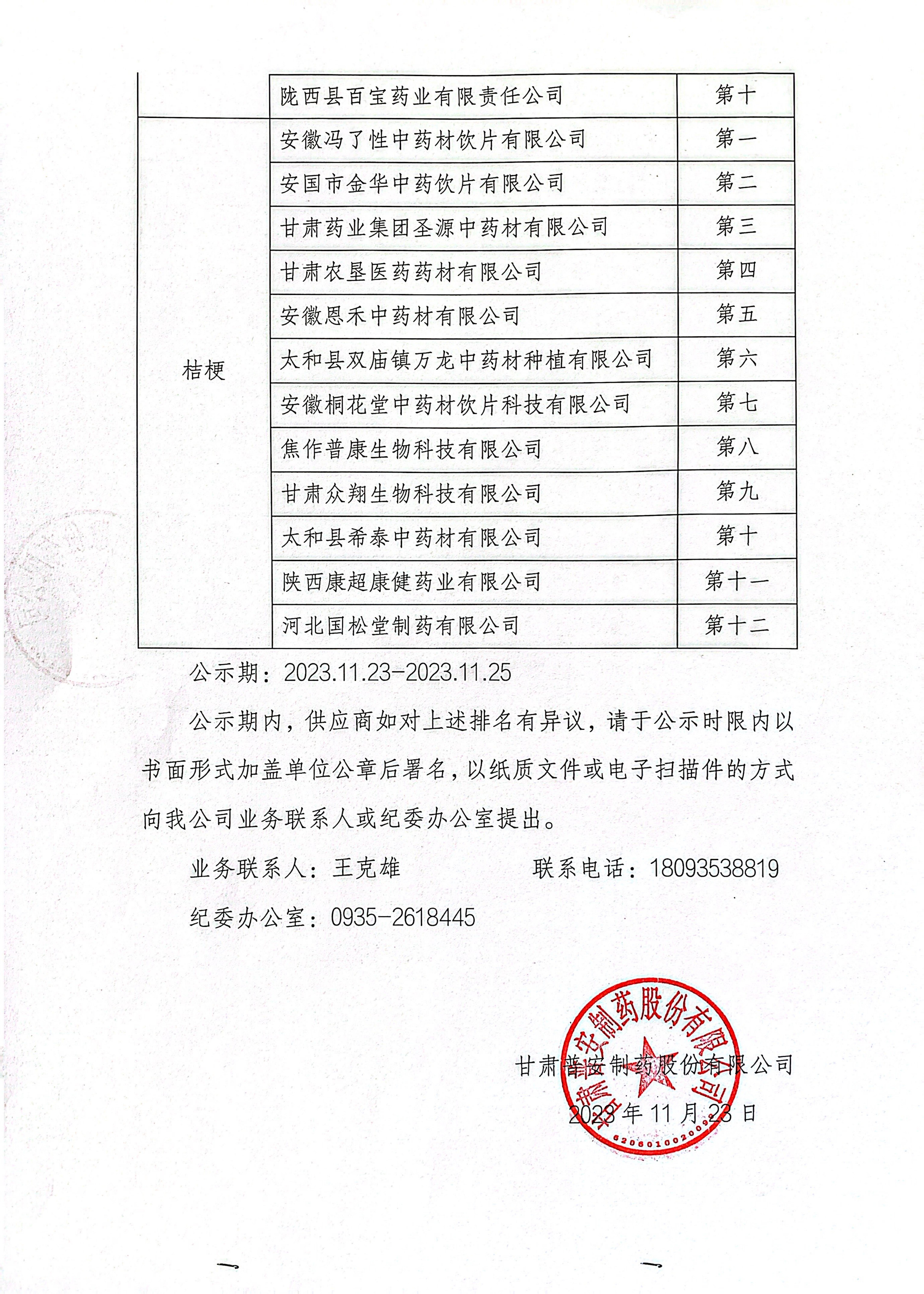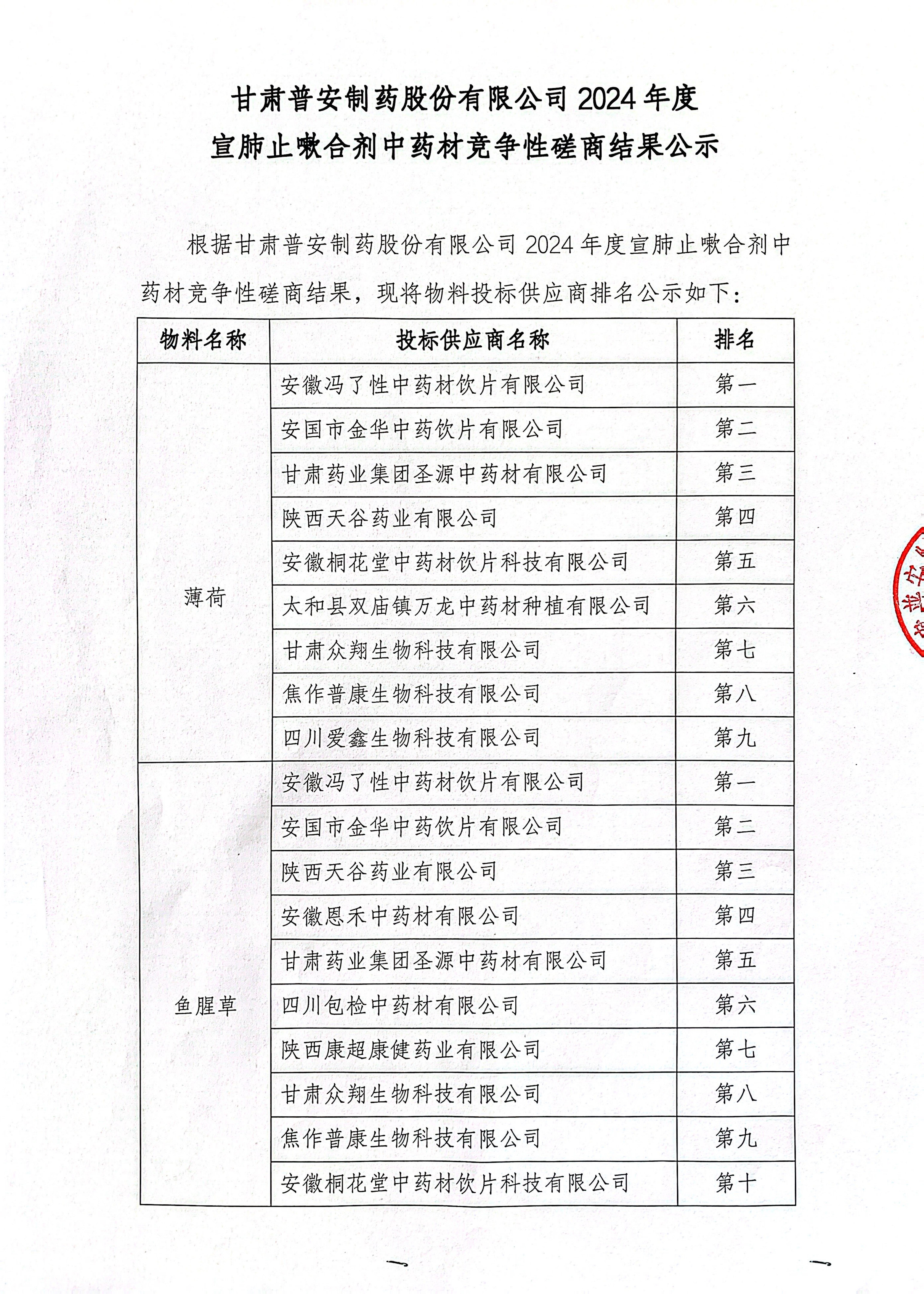 甘肅普安制藥股份有限公司2024年度宣肺止嗽合劑中藥材競(jìng)爭(zhēng)性磋商結(jié)果公示