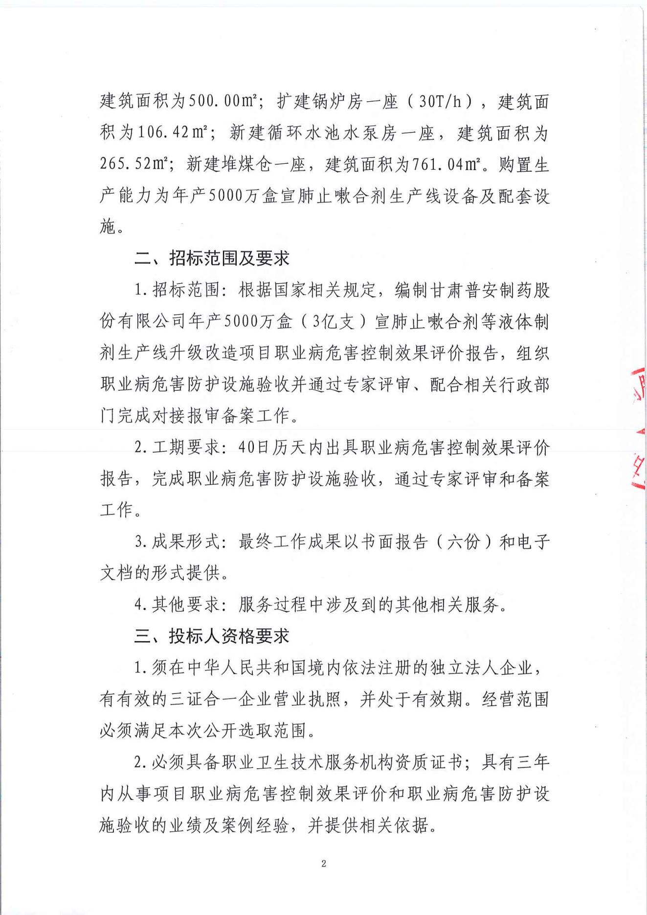 甘肅普安制藥股份有限公司年產(chǎn)5000萬盒(3億支)宣肺止嗽合劑等液體制劑生產(chǎn)線升級改造項目職業(yè)病危害防護(hù)設(shè)施驗收服務(wù)招標(biāo)公告